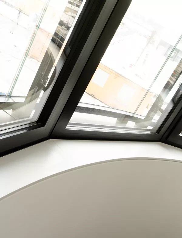 Ein weiteres technisches Detail ist die Schattennut, welche das Fensterbrett vom Anschluss an die gerundete Vorsatzschale trennt und einen präzisen Übergang ermöglicht.